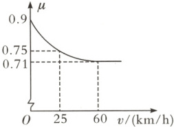 $}$,正确;选项C:分析“$\mu\geqslant 0.71$”对应的$v$范围。当$v = 60$时,$\mu = 0.71$,且$v\lt 60$时,$\mu\gt 0.71$(图象在$v = 60$左侧更高);当$v\gt 60$时,$\mu\lt 0.71$(图象右侧更低),故“$\mu\gt 0.71$”对应“$v\lt 60$”,选项中“不低于$60\ \mathrm{km/h}$”错误;