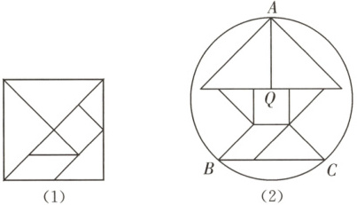 典例 (宿迁宿城区二模)传统的七巧板是从我国宋代的“燕几图”演变而来的,嘉琪同学用边长为$4\sqrt{2}$的正方形纸板做出如图(1)所示的七巧板,拼接成小鱼图案(外轮廓是轴对称图形)并把图案放到圆中,如图(2)所示,$A$,$B$,$C$三点在圆上,圆的半径是