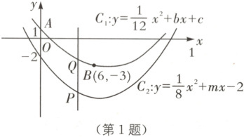 1. 数形结合思想 如图,在平面直角坐标系中,抛物线$ C_1:y=\frac{1}{12}x^2+bx+c $的图象经过$ A(0,1) $,$ B(6,-3) $两点。点$ P $是抛物线$ C_2:y=\frac{1}{8}x^2+mx-2 $在第四象限部分上的动点,且位于抛物线$ C_1 $的下方,过点$ P $作直线$ PQ \perp x $轴,交抛物线$ C_1 $于点$ Q $。