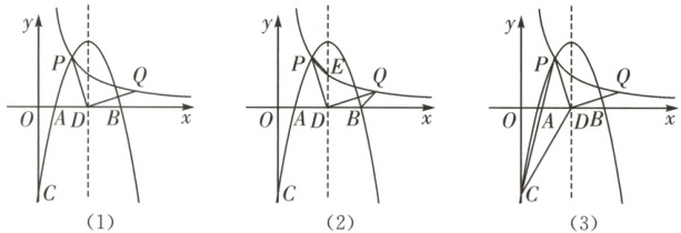 (2)如图(2),双曲线与抛物线的对称轴交于点$E$,连接$PE$,$BQ$。求证:$\angle DPE = \angle DQB$;