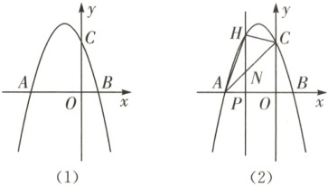(2) 如图(2),若$ P $是线段$ OA $上一动点,过点$ P $作$ y $轴的平行线交抛物线于点$ H $,交$ AC $于点$ N $,设点$ P $的横坐标为$ t $,$ \triangle ACH $的面积为$ S $. 求$ S $关于$ t $的函数关系式. 当$ t $取何值时,$ S $有最大值?求出$ S $的最大值.