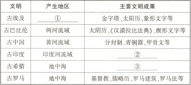 (1)①尼罗河流域;②佛教等;③雅典民主政治(或帕特农神庙、《荷马史诗》等)。