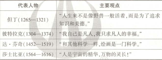 (1)主张:追求知识和美德;享受现世幸福;重视科学;肯定人的价值。(答出三点即可)核心思想:人文主义。