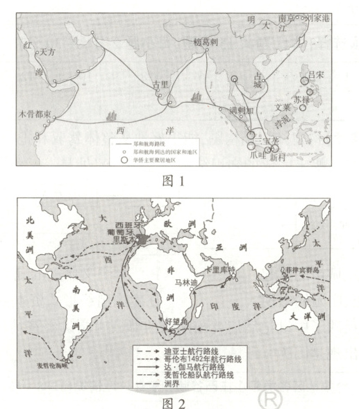 (2)对比两幅地图,提取两个不同点并结合所学知识加以说明。(要求:观点明确,史论结合,表达清楚)(8分) 活动范围变化:图1,从亚洲到非洲;图2,从欧洲到美洲、非洲、亚洲等。航海活动的主导国家变化:图1,中国;图2,西欧国家(葡萄牙、西班牙)。(其他观点,论述合理亦可)