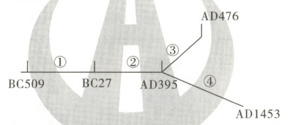 13. 【时空观念】下图是某学生在复习古代某国发展历程这一专题时所绘制的年代尺(BC指公元前,AD指公元)。请你判断,图中③处国家的名称应为(