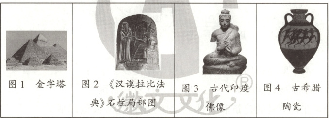 (2)综合材料中的图片信息并结合所学知识,指出世界古代文明呈现出的主要特征。(4分)