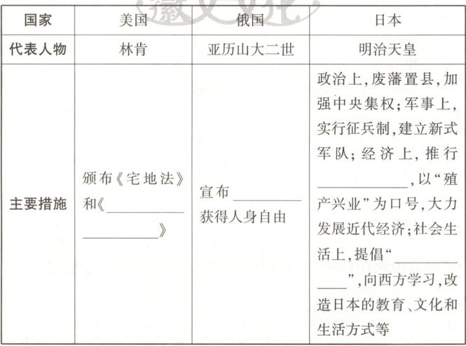 (1)美国:南方以种植园经济为主,大量使用黑奴劳作,奴隶制严重阻碍了美国资本主义经济的进一步发展,导致国家面临分裂的危机。俄国:农奴制严重阻碍了俄国资本主义经济的发展。日本:外国势力的入侵导致国家有沦为殖民地的危机。