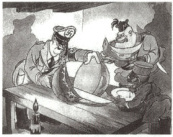 9. 【跨学科·美术】下图是20世纪40年代初期美国媒体上的一幅漫画。漫画中的三个卡通人物形象分别是希特勒、墨索里尼和广田弘毅,他们正在切瓜,而瓜皮上的纹理是一幅世界地图。下列选项中最适合作为该漫画主题的是(