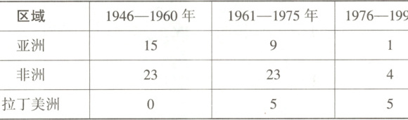 9. 下表是1946—1990年,亚非拉人民摆脱殖民统治赢得独立的国家数量统计表,据此推断(