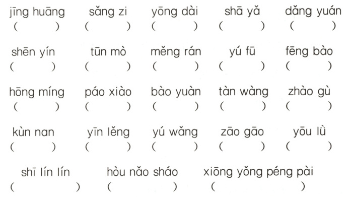 1.惊慌 2.嗓子 3.拥戴 4.沙哑 5.党员 6.呻吟 7.吞没 8.猛然 9.渔夫 10.风暴 11.轰鸣 12.咆哮 13.抱怨 14.探望 15.照顾 16.困难 17.阴冷 18.渔网 19.糟糕 20.忧虑
