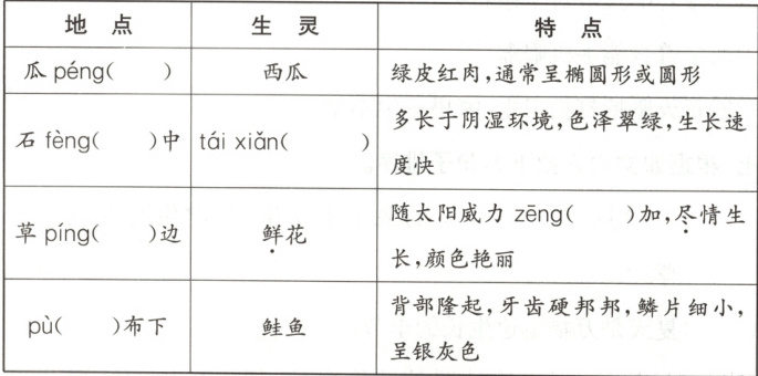 二、1. 棚 缝 苔藓 坪 增 瀑 2.