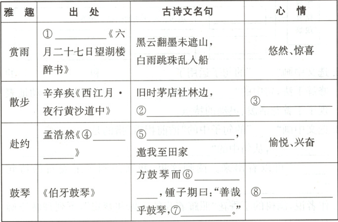 (宁波江北)分门别类辑诗文。下面是某同学以“古人的雅趣”为主题整理的古诗文材料。请在横线处填写相应的出处、古诗词名句,并点评诗人的心情。