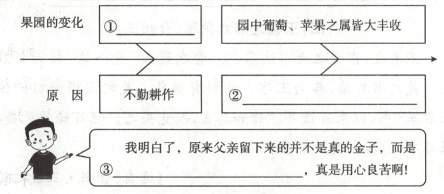 有父子二人,居山村,营果园。父病后,子不勤耕作,园渐荒芜。一日,父病危,谓子曰:“园中有金。”言讫①而逝。子翻地寻金,无所得,甚怅然。而是年秋,园中葡萄、苹果之属②皆大丰收。子始悟父言之理。