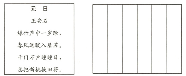 2. 爆竹声声传祥瑞,喜气洋洋迎新岁。请把下面关于春节的诗句抄在竖格内。每一行诗句居中,注意上下、左右文字要对齐。(3分)