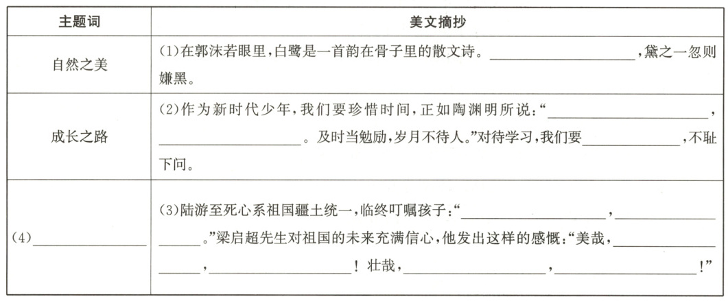 5. 小帆对诗词美文进行了摘抄,请你根据课文内容,帮助她补充完整。(7分)