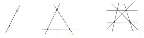 4. 摆正几何水晶的位置后,需要通过最终关卡来启动几何水晶。如图,经过纸上2个点可以画1条直线,经过3个点中的每两个点最多可以画3条直线,经过4个点中的每两个点最多可以画6条直线,那么5个、6个点呢?