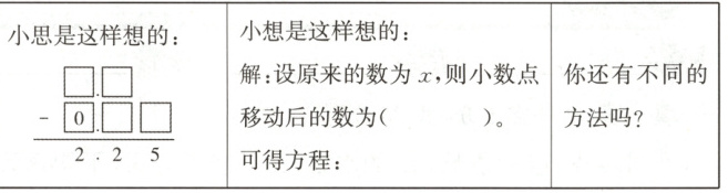7. (台州仙居)一个数的小数点向右移了一位后比原数大了 $2.25$,这个数原来是多少?在解决这个问题时,小思和小想用了不同的方法,请你帮他们把方法补充完整:(6 分)