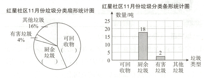 5. (衢州江山、开化)近几年来,政府积极推进全民进行垃圾分类。笑笑调查了红星社区 2024 年 11 月份垃圾分类情况,并制作了如下所示的两幅不完整统计图。请根据统计图解决下列问题。