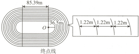 6. (杭州拱墅)杭州奥体中心体育场——“大莲花”的内部配有奥体训练场,被设计成标准400m的综合田径场,两端是半圆形,中间是长方形。半径36.5m,直道长85.39m,道宽1.22m。如果在这个场地组织400m田径比赛,下列关于各起跑线相差的距离,说法正确的是(