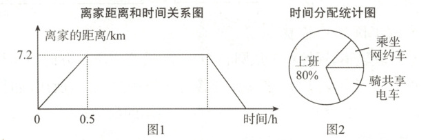 2. (宁波镇海)一位文物修复工作者早上骑共享电车到故宫博物院上班,中午乘坐网约车回家。她所用的时间与离家距离的关系如图1所示,所用时间分配统计图如图2所示。(12分)