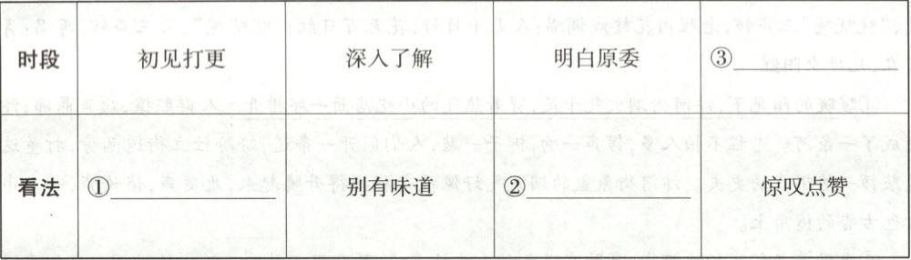 解析:本题考查内容理解与概括。第一空,结合第②段“早听说老程在汴河街打更,……问老程为何白天打更”可知,“我”此时对老程打更行为的不以为意,是轻视的。第二空,结合第⑥段“他话锋一转,说在这条古街上打更的意义在于唤醒历史中的记忆”及第⑦~⑧段可知,“我”跟着老程在汴河街穿行过程中,明白了老程打更的原因,“我内心猛地一震”,对老程打更的理解有了质的变化。第三空,结合第⑨⑩两段内容可知,“我”了解了老程的打更设想后,理解了他对传统文化的坚守与传承的深意,不禁发出赞叹。据此分析作答即可。