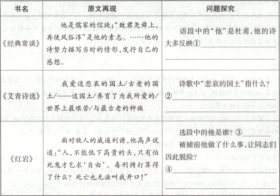 18.社团开展“读经典作品,悟家国情怀”专题活动,请根据阅读积累,完成阅读卡。(4分)