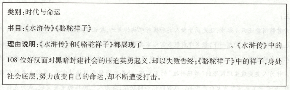(1) 小唐选择为《水浒》《骆驼祥子》设计类别名,请补写“理由说明”中的内容。(2分)