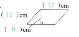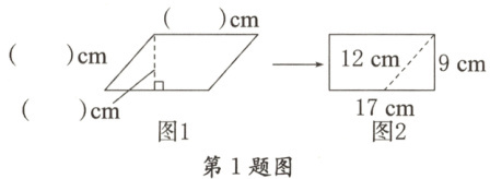 1. 在探究平行四边形的面积公式时,明明将图1中的平行四边形沿着一条高剪开,经过平移,拼成了图2中的长方形。请根据长方形中标注的数据,将图1中的数据补充完整;根据明明的推导过程,图1中的平行四边形的面积可以列式计算为( )(cm²)。
