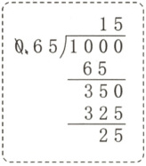 4. 新考法 算理算法 许老师为烘焙课做准备,要把 10 L 的色拉油分装在容量为 0.65 L 的油壶中,至少需要几个这样的油壶?明明列竖式(如图)解决该问题。从竖式中可以得到的信息有(