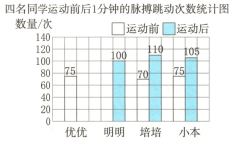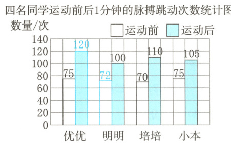 新情境 安全健康 开心小学推行体育与健康课程,要求学生每节体育课运动技能练习时间达到 20 分钟,体能练习时间达到 10 分钟,运动强度达到心率 140~160 次/分。体育老师首周安排了 20 分钟的中低强度运动,结束后抽测了四名同学运动前后 1 分钟的脉搏跳动次数(如图)。