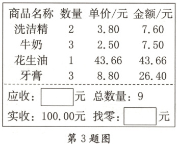 3. 下图是妈妈在开心超市购物时的小票,请把小票补充完整。