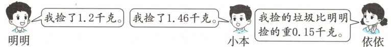 2. 明明、小本和依依参加社区组织的“爱护环境,从我做起”活动。结合下面的对话信息,求依依捡的垃圾比小本捡的轻多少千克,列式正确的是(