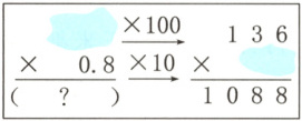 1. 明明在探究小数乘法时,不小心将墨水滴在了竖式上,请观察他的探究过程(如图)。