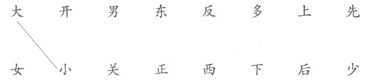 开——关 男——女 东——西 反——正 多——少 上——下 先——后 [点评]本题考查反义词。联系课内所学及生活经验完成连线。