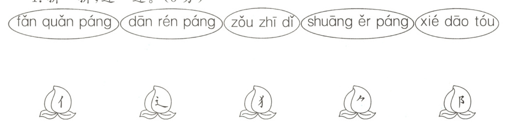 fǎn quǎn páng——犭 dān rén páng——亻 zǒu zhī dǐ——辶 shuāng ěr páng——阝 xié dāo tóu——⺈ [点评]本题考查拼音认读的能力及对偏旁名称的掌握。在读准拼音的基础上找出相对应的偏旁完成连线。