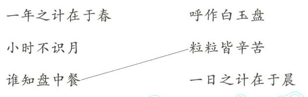 一年之计在于春——一日之计在于晨 小时不识月——呼作白玉盘【点评】本题考查“日积月累”的识记与背诵,连线时注意记忆的准确,不要张冠李戴。