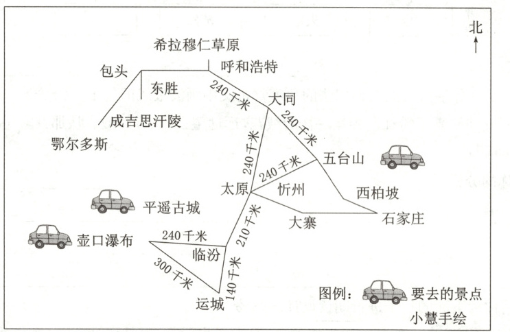(3) 示例:从运城向西北行驶 300 千米到壶口瀑布;然后向东 240 千米到临汾;之后向东北 210 千米到太原,途中游览平遥古城;接着从太原向东北 240 千米到五台山;然后向西北 240 千米到大同;最后再向西北 240 千米到呼和浩特。