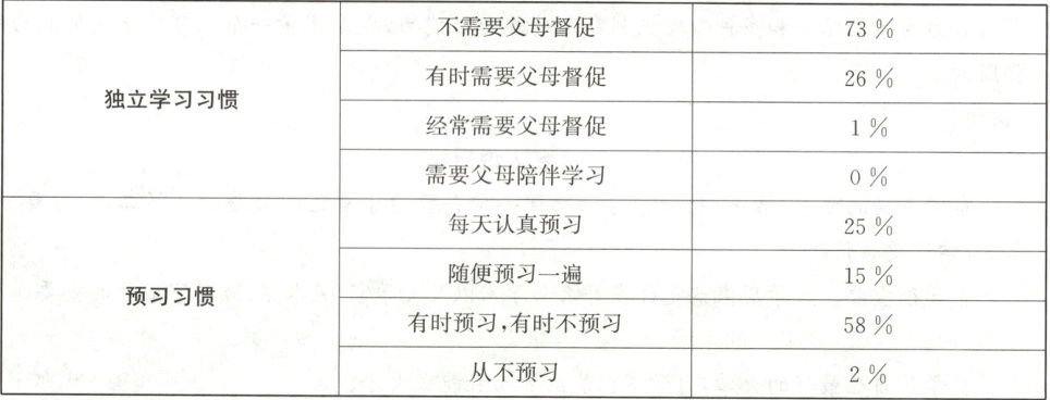 七年级学生独立学习习惯及预习习惯的调查统计表