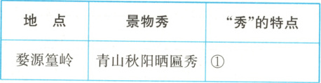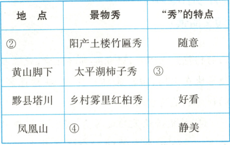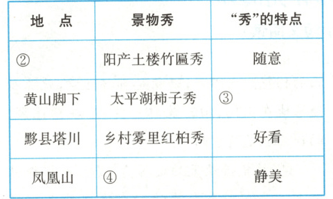 (1)①色彩缤纷 ②皖南歙县 ③如画 ④人树共秀(每空1分)
