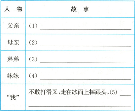 8. [初读·贵在梳理]作者在文章结尾说“我在文字里记下了那些年的风雪,那些风雪里的岁月,那些岁月里的温暖亲情、成长故事……”作者记下了哪些“温暖亲情”与“成长故事”?请结合文章内容完成表格填写。(5 分)