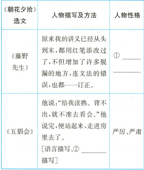 (1)[内容梳理]《朝花夕拾》中,前七篇记述了鲁迅儿童时期在故乡的生活片段,后面的《琐记》《藤野先生》和