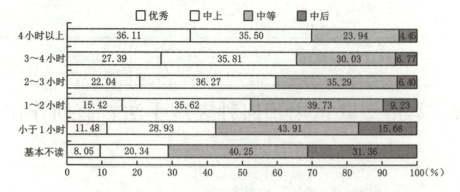 。且从每周自主阅读的时长和语文成绩的关系来看,(2)中小学生每周阅读时长越长,语文成绩越优秀;每周阅读4小时以上的学生,语文成绩优秀的占比最大