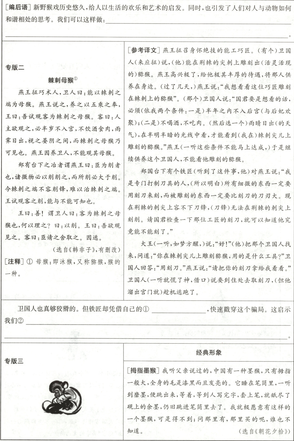 (2)阅读专版二的寓言故事《棘刺母猴》,并把对它的评价补充完整。(4 分)