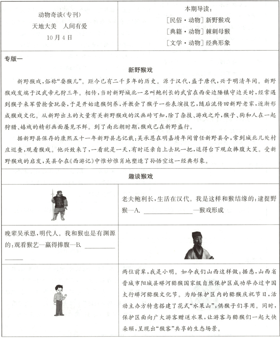 ①根据《新野猴戏》的内容,补全人物对话。(1 分)
