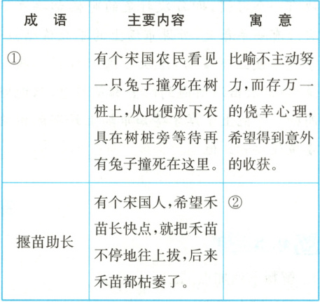 (2)在书面表达和口语交际中,成语极富表现力,许多成语都源于寓言故事,请你根据提示,完成下面表格。