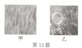 13. 人间最美三月天,春花灿烂绽新颜。如图是课外实践小组用焦距为$10 cm$的凸透镜观察植物生长情况的情景,下列说法正确的是(
