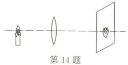 14. 周末小明在家利用凸透镜和蜡烛进行实验探究,如图所示,墙上出现一个倒立、放大、清晰的烛焰的像。下列说法正确的是(