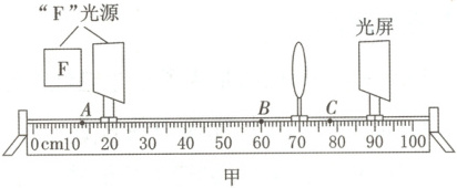 3. 近视程度不同的同学需要戴焦距不同的眼镜。为了探究近视眼的矫正过程,组装如图甲所示的实验装置,其中用“F”字样的光源代替可视物体,光屏模拟视网膜。选用如图乙所示的2号凸透镜模拟晶状体,打开“F”光源,调节各个元件的位置,直到光屏上呈现倒立、缩小的清晰像,正常眼睛的视物模型便组装完成。回答下列问题:
