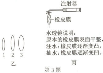 (填序号)号透镜代替2号透镜安装在光具座上,此时光屏上的像变模糊。(2)用如图丙所示的水透镜模拟近视眼镜矫正视力。应将水透镜置于光具座上的