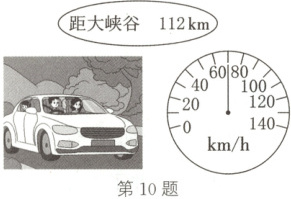 10. (2024·大同平城段考)国庆期间,小铭一家开车去太行山大峡谷游玩。中途的某一时刻,他们与大峡谷的距离和车上的速度表指针如图所示。若小铭爸爸开车一直以此速度行驶,则他们到达大峡谷所用的时间为(